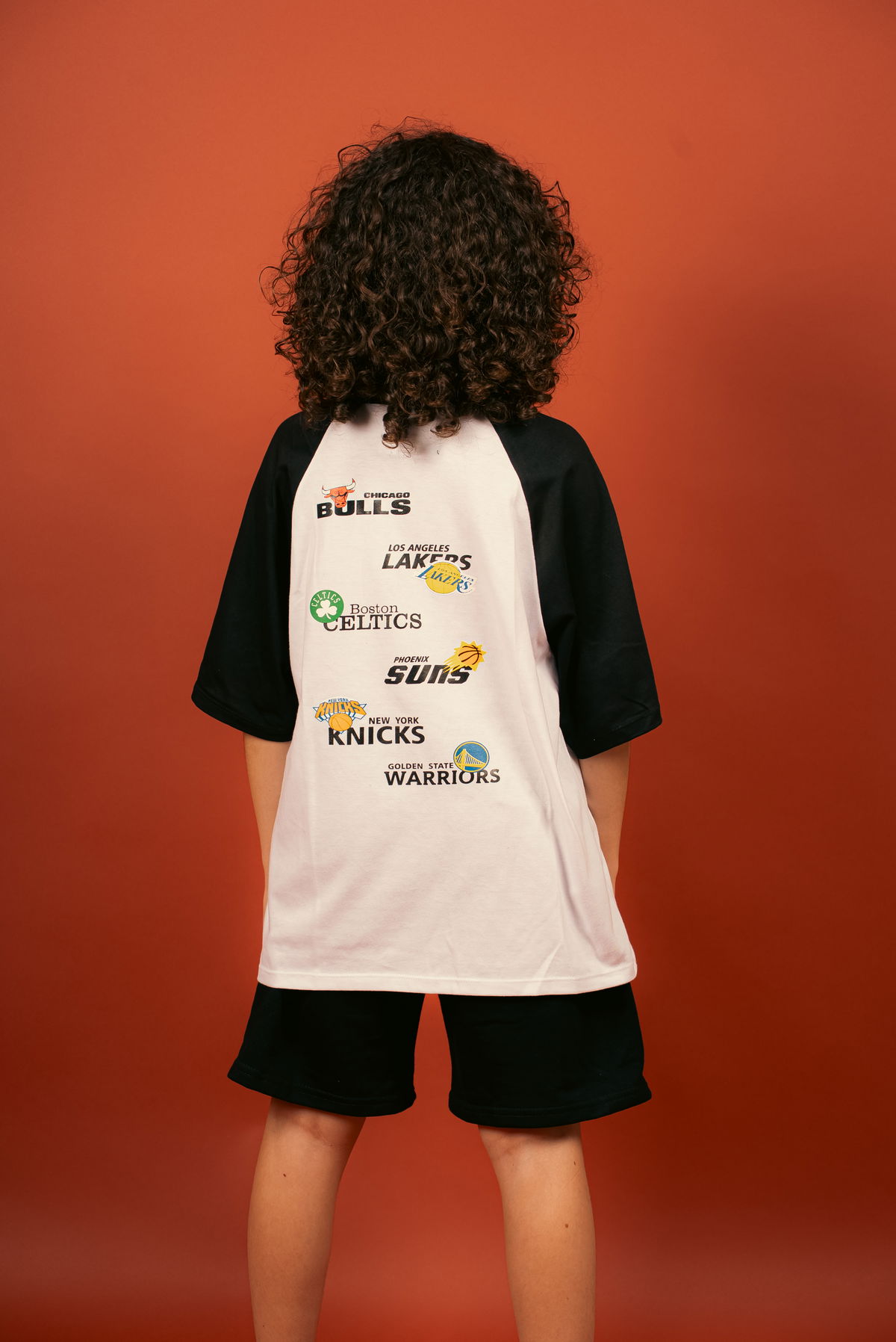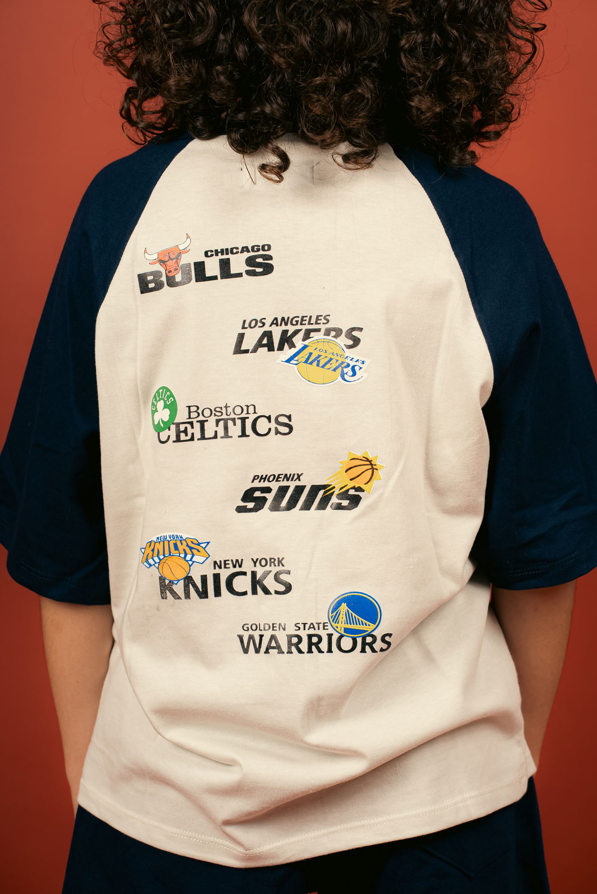 Remera juvenil NBA de manga raglan, con cuerpo y mangas combinadas. Estampa frontal NBA y diseño trasero con equipos de la liga.
