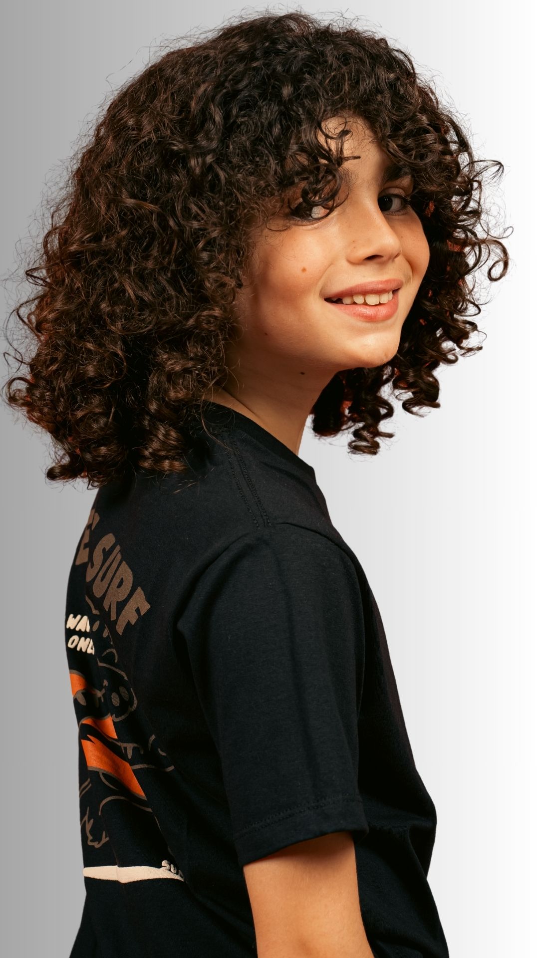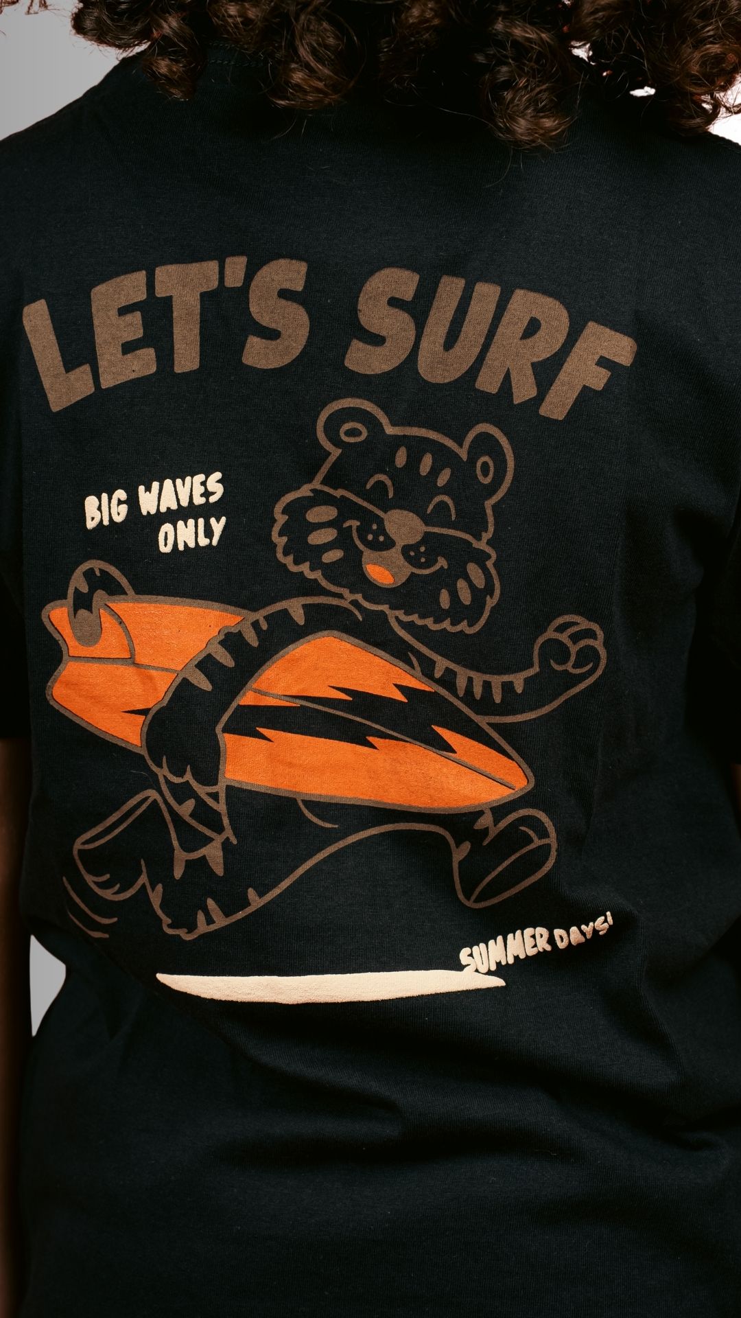 Remera infantil de jersey con estampa frontal “LET’S SURF” en relieve y gráfica trasera de un gatito con tabla de surf. Calce cómodo, fresco y divertido, ideal para verano y estilo playero.