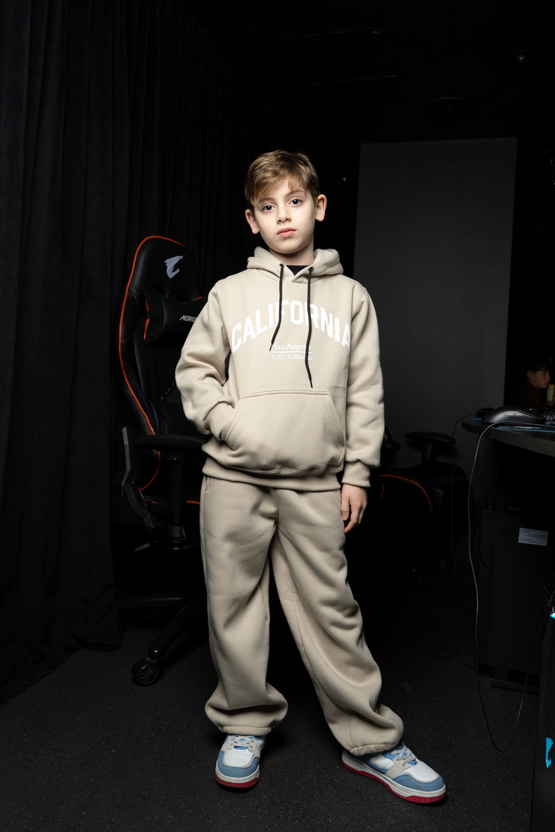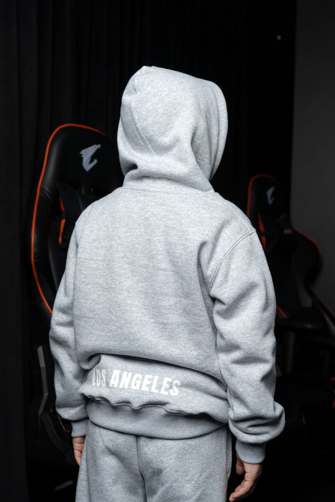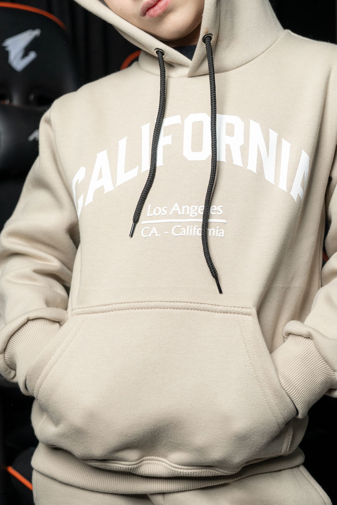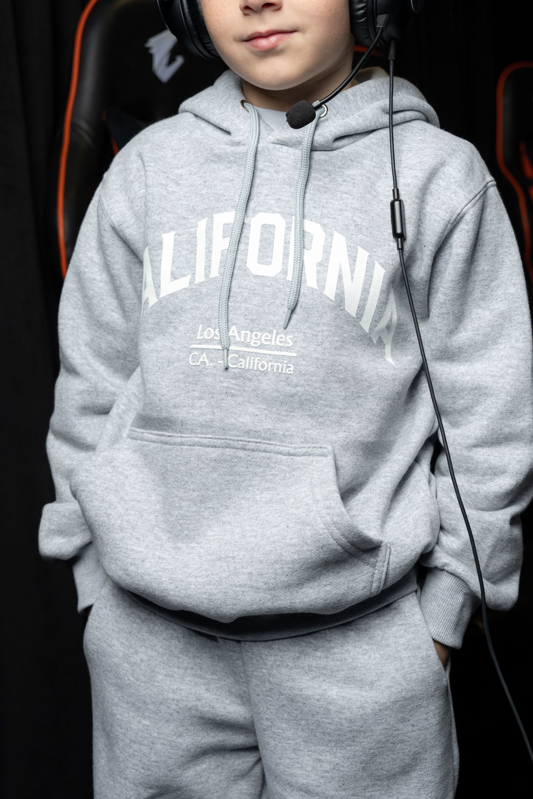 Buzo urbano de frisa color gris melange con capucha y estampa “California” al frente. Ideal para un look canchero y cómodo.